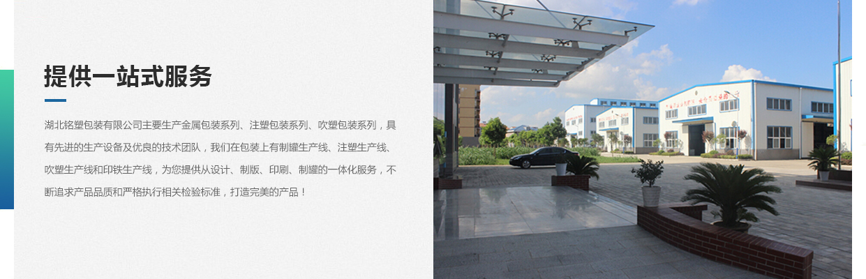 湖北銘塑包裝有限公司一家集研發(fā)、生產(chǎn)、銷售于一體的較優(yōu)秀民營企業(yè),技術力量雄厚,產(chǎn)品質量可靠。位于交通暢順,百業(yè)興旺、經(jīng)濟富裕、政策開放的孝感開發(fā)區(qū)域。我們企業(yè)的營銷戰(zhàn)略是以建筑為土壤,以產(chǎn)品為種子,以質量為肥料,讓綠色鋪滿全球。憑借多年來的行業(yè)經(jīng)驗,公司不斷進行創(chuàng)新和研發(fā),為市場提供更廣泛的產(chǎn)品應用領域和更好環(huán)保節(jié)能產(chǎn)品,為國家能源環(huán)保戰(zhàn)略和可持續(xù)發(fā)展戰(zhàn)略作出應有的貢獻。 湖北銘塑包裝有限公司主要生產(chǎn)金屬包裝系列、注塑包裝系列、吹塑包裝系列,具有先進的生產(chǎn)設備及優(yōu)良的技術團隊,我們在包裝上有制罐生產(chǎn)線、注塑生產(chǎn)線、吹塑生產(chǎn)線和印鐵生產(chǎn)線,為您提供從設計、制版、印刷、制罐的一體化服務,不斷追求產(chǎn)品品質和嚴格執(zhí)行相關檢驗標準,打造更好的產(chǎn)品!